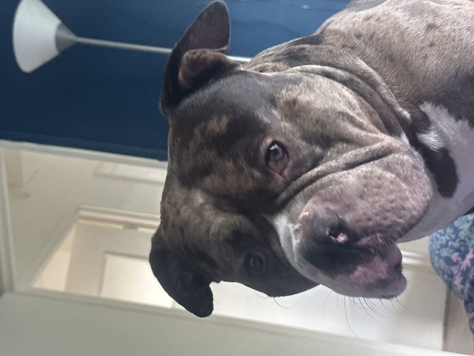 - "The scene depicts a brindle-patterned dog, consistent with a bulldog or similar breed, situated indoors within the city of Stains, France" by FM-lS6eB2, licensed under CC BY 4.0