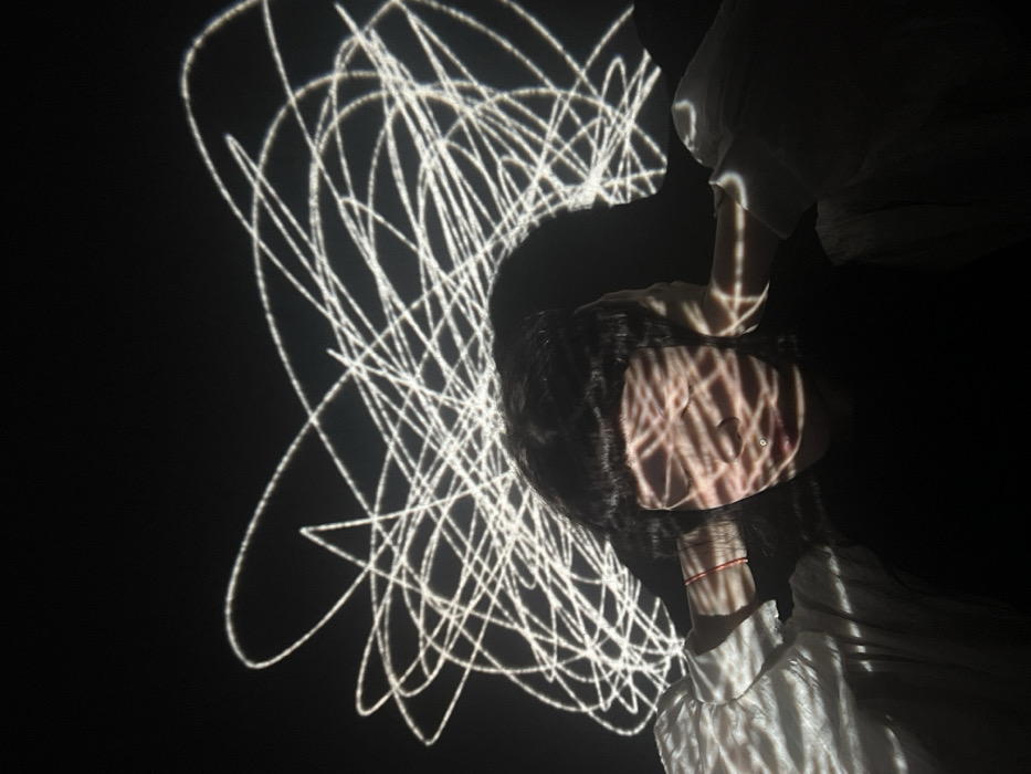 The scene is set in Chaikovsky, Russia, within a dark, undifferentiated environment featuring a black background. A single individual, appearing to be an adult with dark, wavy hair and bangs, is centrally positioned. Their face, obscured by projected light patterns, shows a visible piercing below the right side of the lower lip. Both hands are raised, covering the ears. The individual wears a dark garment on the torso and light-colored, long-sleeved clothing on the arms; a thin red string or bracelet is visible on the left wrist. Overlapping and intersecting white luminous lines are projected across the upper portion of the frame, extending onto the individual's head, face, and arms, creating distinct stripe-like light and shadow patterns. No other objects or interactions are visible.