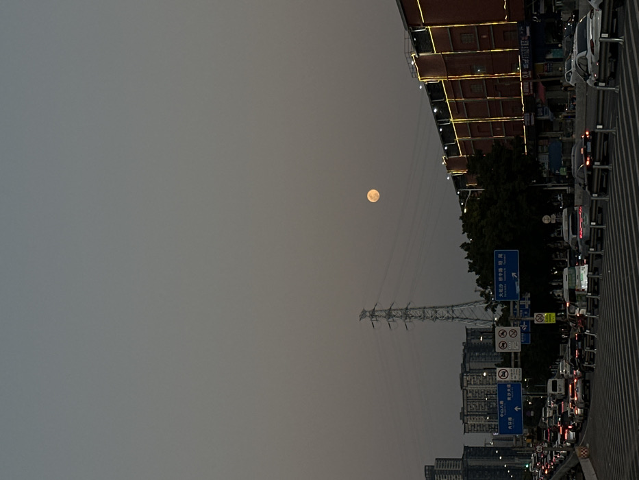 The image depicts an urban street scene at dusk or early night in Liwan District, Guangzhou, China, characterized by heavy traffic and prominent celestial and infrastructural elements. The sky, occupying the upper two-thirds of the frame, is a hazy, grayish-brown, against which a bright, orange-yellow full or near-full moon is visible in the upper-right quadrant. In the midground, a multi-lane road is congested with numerous vehicles, including cars and vans, their headlights and taillights visible, indicating stationary or slow-moving traffic. Overhead blue directional signs with white Chinese characters and Pinyin are present, identifying destinations such as "大坦沙 DATANSHA," "中山八路 ZHONGSHAN BALU," and "河沙 HESHA," confirming the location in Guangzhou's Liwan District. A tall, gray metal lattice power transmission pylon stands prominently on the left side of the road, extending upwards. To the right of the road, a large, multi-story brick-red building is visible, illuminated by distinctive yellow string lights outlining its architectural features. Dark green trees partially obscure the lower portion of this building. In the background, behind the pylon and traffic, multiple urban buildings of varying heights are discernible. No specific individuals or direct human interactions are clearly visible within the frame. The scene is dominated by urban infrastructure, vehicular activity, and atmospheric conditions.