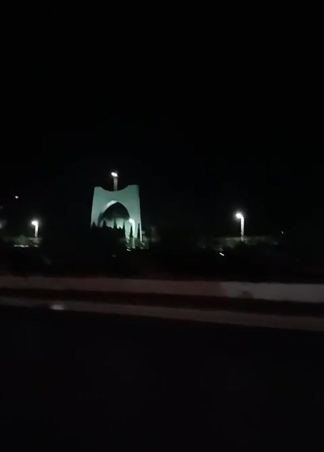 dark, night-time scene. A structure, potentially a monument or building, is visible in the distance, illuminated with green lighting. Street lights are also visible. The camera appears to be moving, possibly from a vehicle, and there is a road in the foreground. The scene is quite dark, and details are difficult to discern.