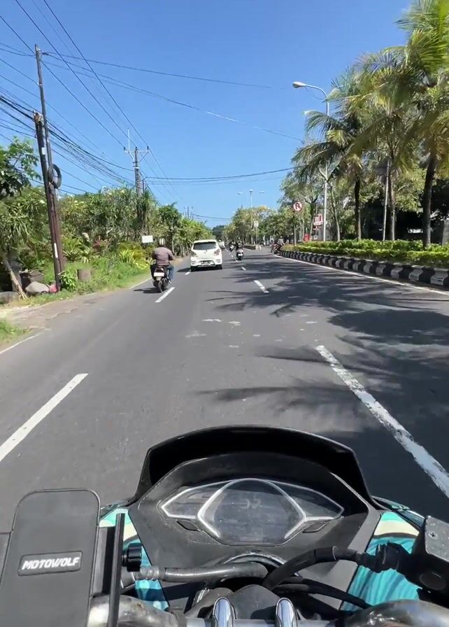 The video, shot from the rider’s perspective, shows a motorcycle traveling down a paved road in what appears to be a tropical or subtropical location