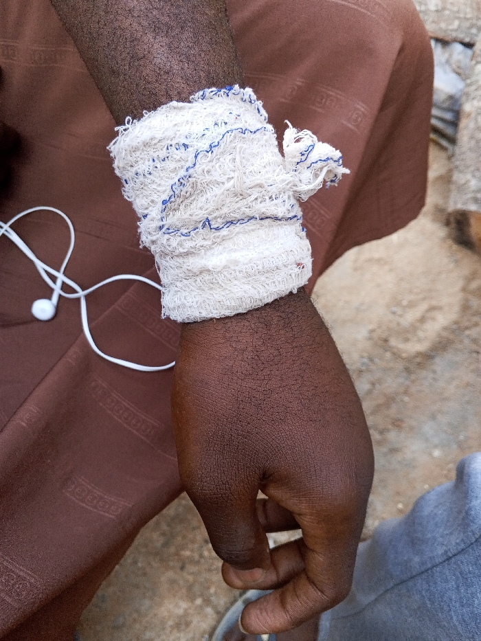 The image captures a close-up, downward-angled view of a dark-skinned individual's right forearm and hand, observed in Akwanga, Nigeria