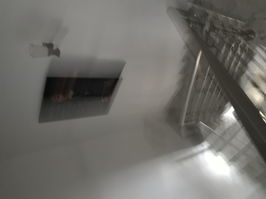 The image displays an interior stairwell within a building situated in Lekki, Nigeria. The perspective is from an elevated position looking downwards. The entire scene is affected by significant motion blur. **Environment:** The predominant features are plain, light-colored walls. A multi-flight staircase, constructed with light-colored steps, descends through the lower and central portions of the frame. The staircase features a modern metal railing system with visible horizontal bars. A bright light source or strong reflection is visible in the lower-left corner, possibly from a window or another light fixture. **Objects:** A wall-mounted light fixture with a translucent, rectangular diffuser is affixed to the upper right wall. Centered on the upper wall, above the staircase, is a rectangular piece of wall art or a mirror. Its content is indistinct due to blurring, but it appears to depict a dark-toned image, possibly a person, within a frame. **People/Actions/Interactions:** No clearly identifiable people, specific actions, or interactions are discernible within the visible scene. The depicted person in the wall art is not distinct enough for identification.
