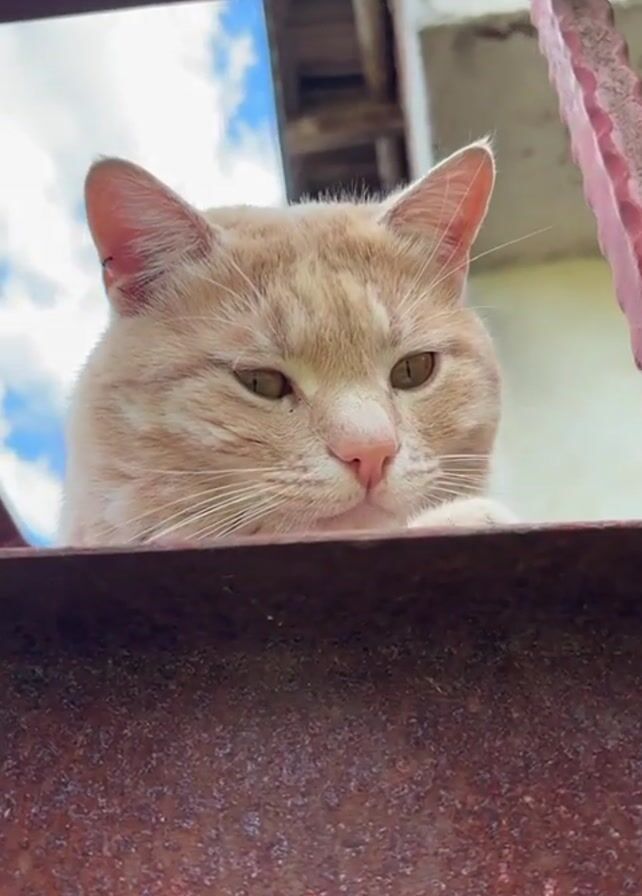 - "light orange tabby cat sitting behind a rusty iron structure, possibly a fence or balcony railing" by FM-X6B8P2, licensed under CC BY 4.0