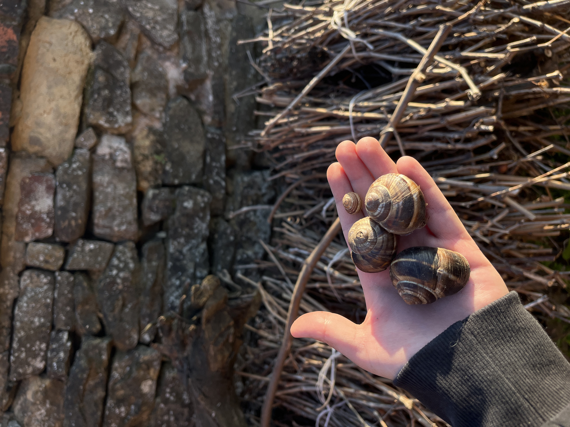A hand holds four snail shells of varying sizes against a backdrop of a stone wall and a pile of small branches
