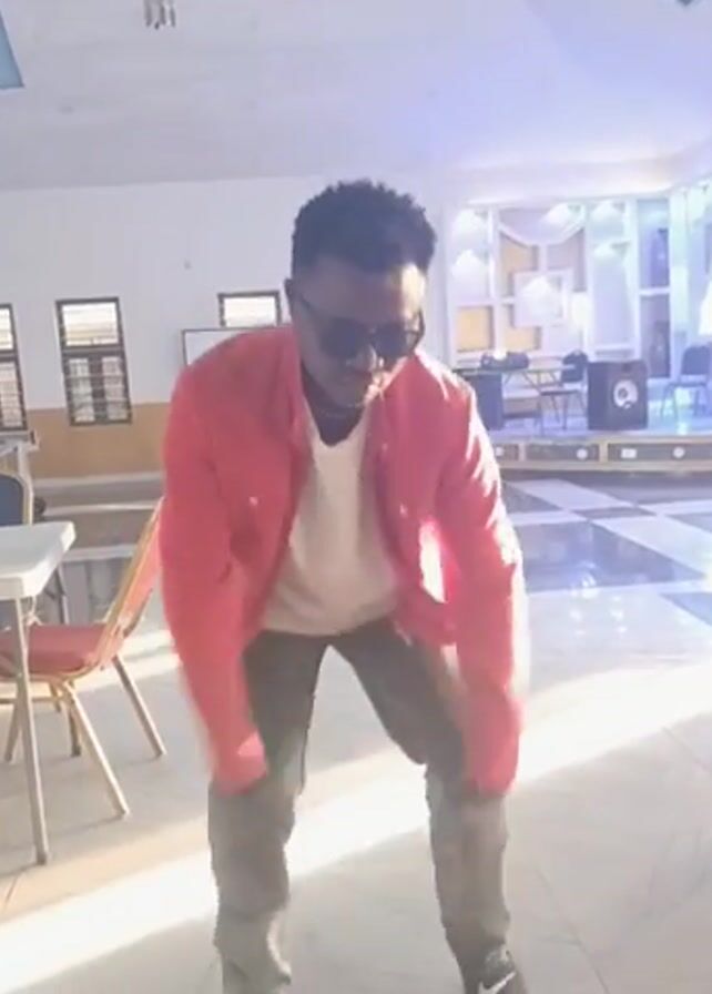 man dancing to music in a large, sparsely furnished room. The man is wearing a red jacket, a white shirt, gray pants, and sunglasses. He is moving his arms and legs in a coordinated manner. The room has a white tile floor, tables and chairs are scattered around, and there's a small stage in the background. The lighting in the room is bright and natural.