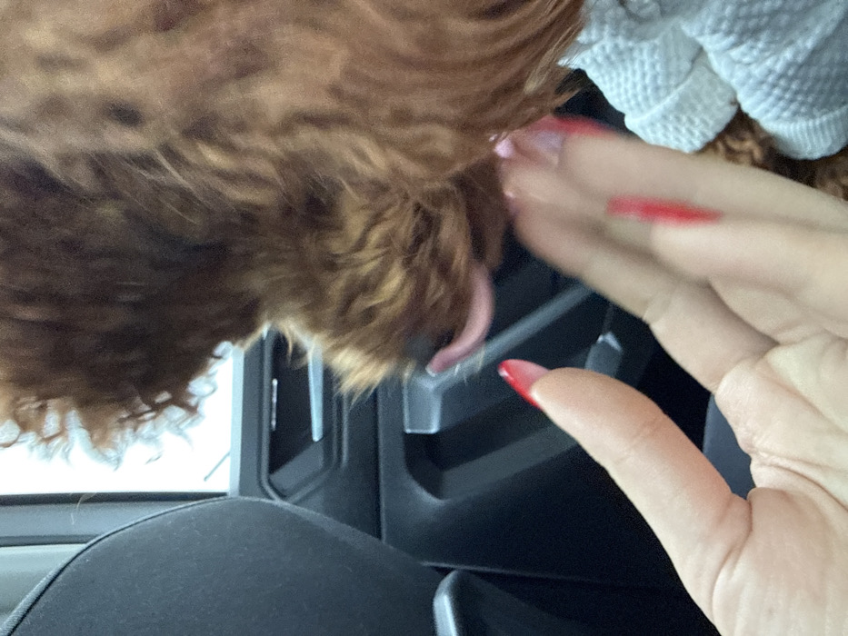 The image captures a close-up scene inside a vehicle in the city of Sofia, Bulgaria. A reddish-brown, curly-haired dog is visible in the upper right quadrant, with its pink tongue slightly extended. The dog is wearing a light-colored, textured sweater or blanket. A human hand, featuring red manicured fingernails, is positioned in the lower left, reaching towards the dog's mouth area, suggesting an interaction. The immediate background shows dark vehicle interior components, including a car seat, dark grey plastic panels, and an air vent. A bright, undifferentiated exterior is visible through a window in the upper left background.