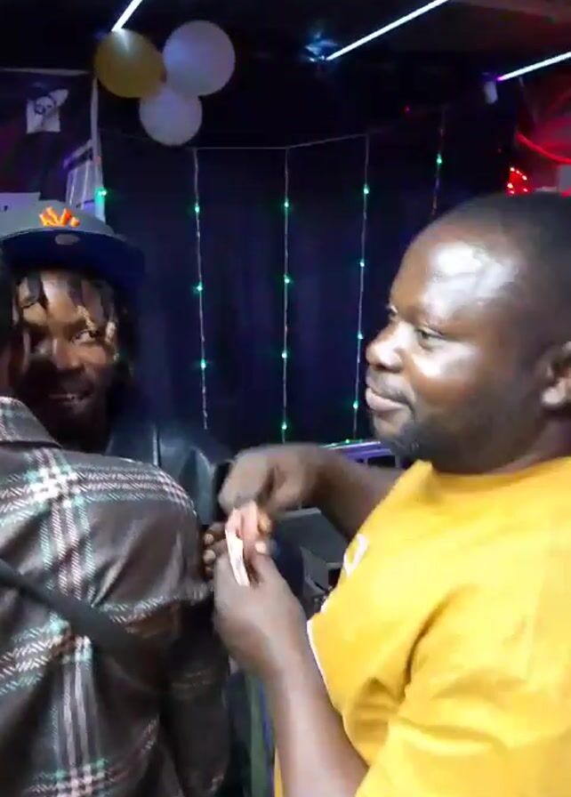 Three men are in a room, possibly a club. One man is wearing a yellow shirt and holding red and white strips in his hand. He is standing near another man in a black leather jacket and blue baseball cap with dreadlocks. The man in the yellow shirt is handing the strips to the man in the leather jacket. A third man in a brown and grey plaid shirt is standing beside the man in the leather jacket. Balloons and lights are in the background. The man in the leather jacket is smiling. The room appears to be decorated with lights and balloons, creating a festive atmosphere.