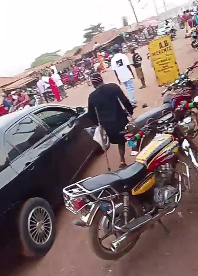 busy street scene, possibly in a market area. In the foreground, there is a black sedan parked on the side of the road, partly blocking the lane. Next to the car are two motorcycles parked. A man dressed in a black robe and wearing a fez is walking away from the car using crutches. Several people are walking and standing around in the background. There are stalls and other vehicles visible in the distance. A sign for "A.B. Merente" can be seen nearby, advertising phone accessories. The ground appears to be dirt.