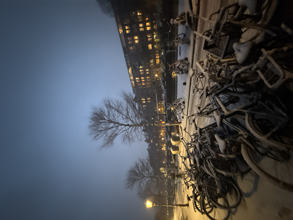 A wintry scene captures a street lined with bicycles covered in snow. A tall building with illuminated windows stands in the background, reflecting warm light against the dark sky. Bare trees punctuate the cityscape, their branches dusted with snow. A vintage streetlight emits a soft glow, illuminating the snowy ground. The image evokes a sense of quiet stillness amidst the cold.