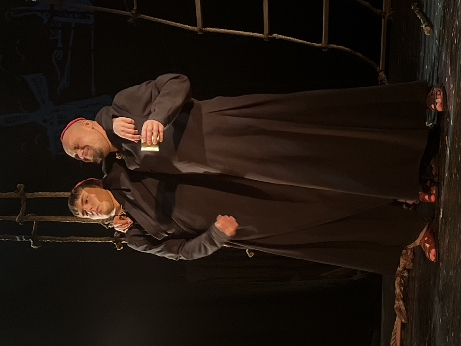 Two adult males are depicted on a dimly lit theatrical stage in Novoshakhtinsk, Russia, dressed in dark, ankle-length robes and red skullcaps, consistent with monastic attire