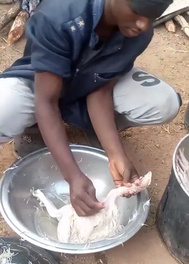 - "A man squats outside and plucks feathers from a dead chicken placed in a silver bowl" by FM-CdLY12, licensed under CC BY 4.0