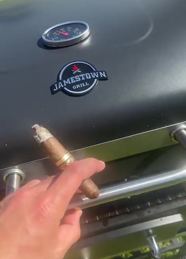 A person holds a cigar in their left hand in front of a black Jamestown Grill with a temperature gauge reading 225 degrees Fahrenheit