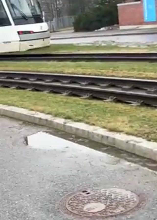 The video depicts a modern, light-rail tram as it travels around a bend on a set of tracks