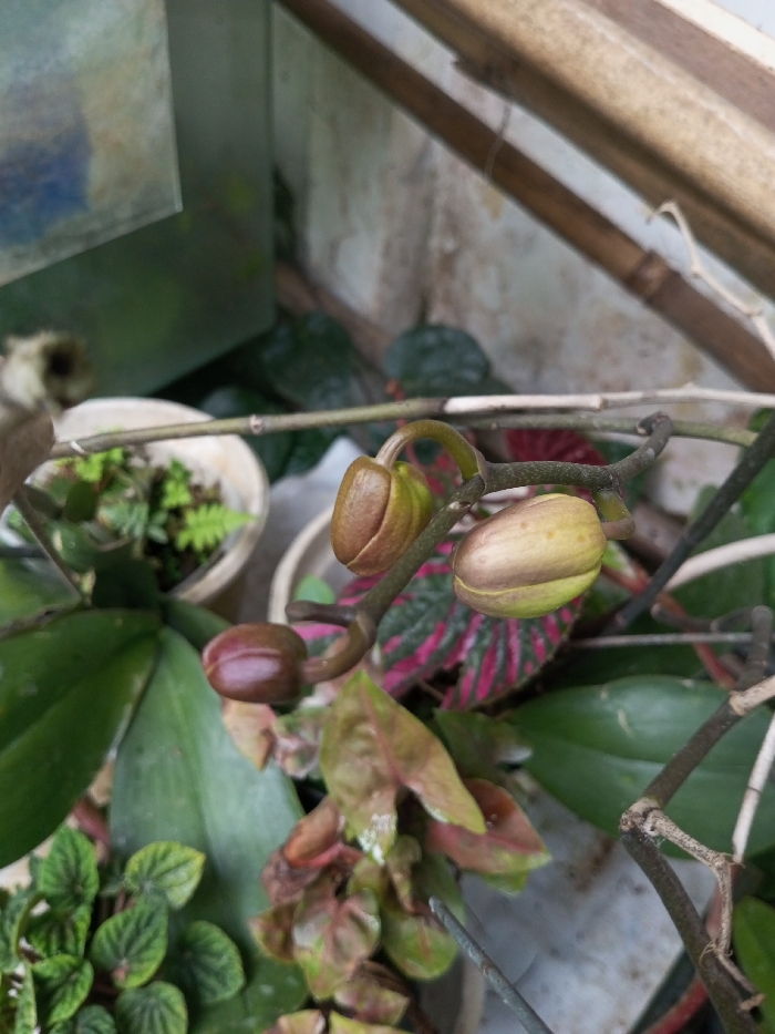 Unopened orchid buds sit atop a plant stand. The buds are brown and yellowish-green in color. Green leaves from other plants surround the orchid. One is small with textured leaves, while another is broad and smooth. A plant with red and green patterned leaves is partially visible behind the orchid. The background includes a window and a wooden structure.