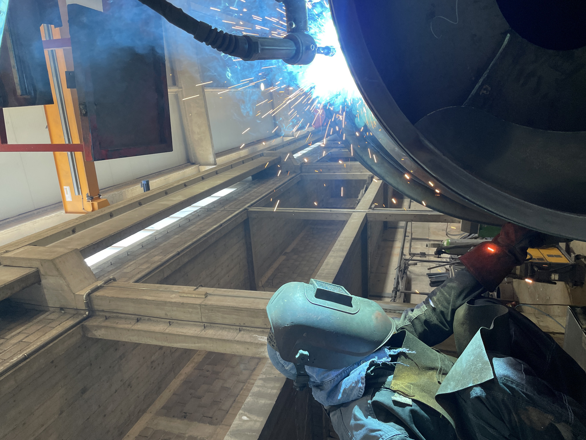 In Čeluga, Montenegro, a welder in protective gear (welding mask, gloves, and heavy clothing) is welding a large, dark metal structure. Sparks fly from the welding point, which is illuminated brightly. The background reveals a large industrial interior with concrete beams and a high ceiling with windows. A yellow safety structure is visible on the left side of the frame. The perspective is looking upwards towards the welder and the welding activity.