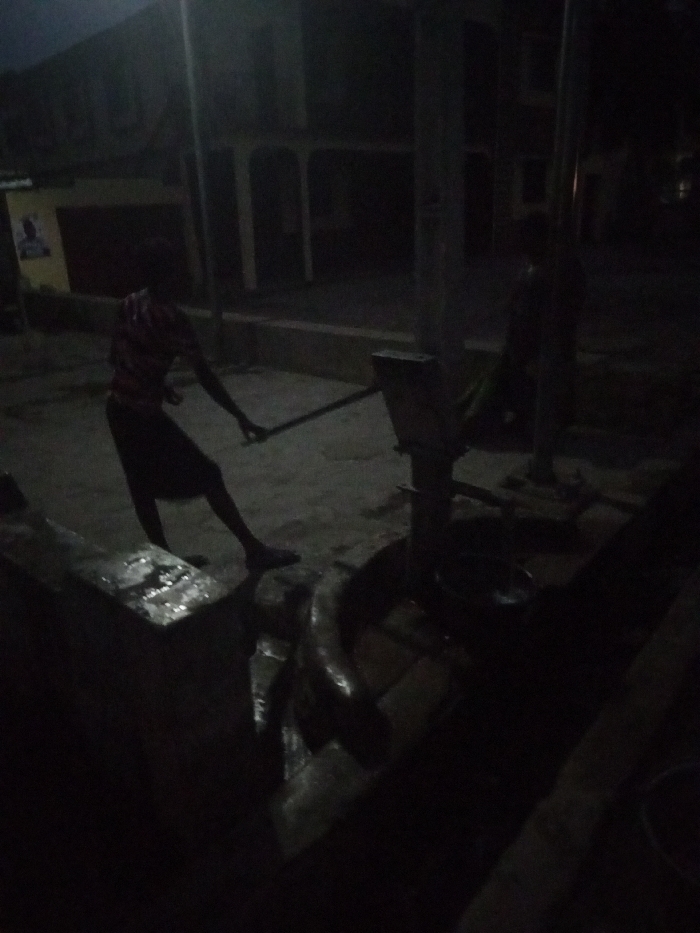 In a dimly lit outdoor setting, a person with striped shirt is using a long object resembling a lever to operate a hand pump over what appears to be a water well. Behind the person operating the pump, another individual stands near a pole. The background features buildings with arched windows and a poster is displayed on a wall. The overall atmosphere is dark and suggests nighttime.