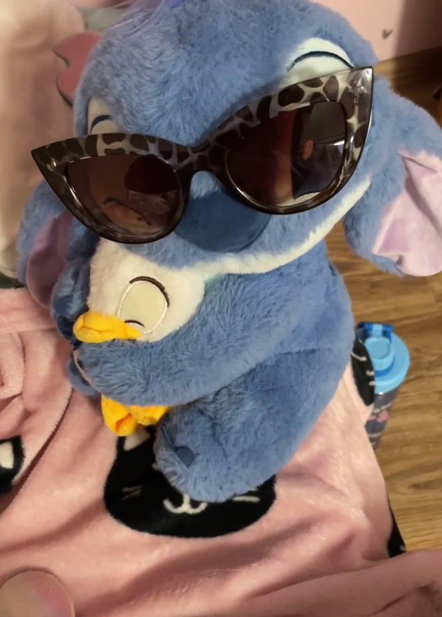 plush toy of the Disney character Stitch, wearing sunglasses and holding a smaller Donald Duck plush toy. Stitch is blue, with white features, and is wearing brown sunglasses with a speckled design. He is hugging a white Donald Duck plushie, whose eyes are closed. Stitch is resting on a pink blanket with a black cat design. The background includes a wooden floor, a pink headboard, and a blue water bottle. The camera zooms in slightly throughout the video.