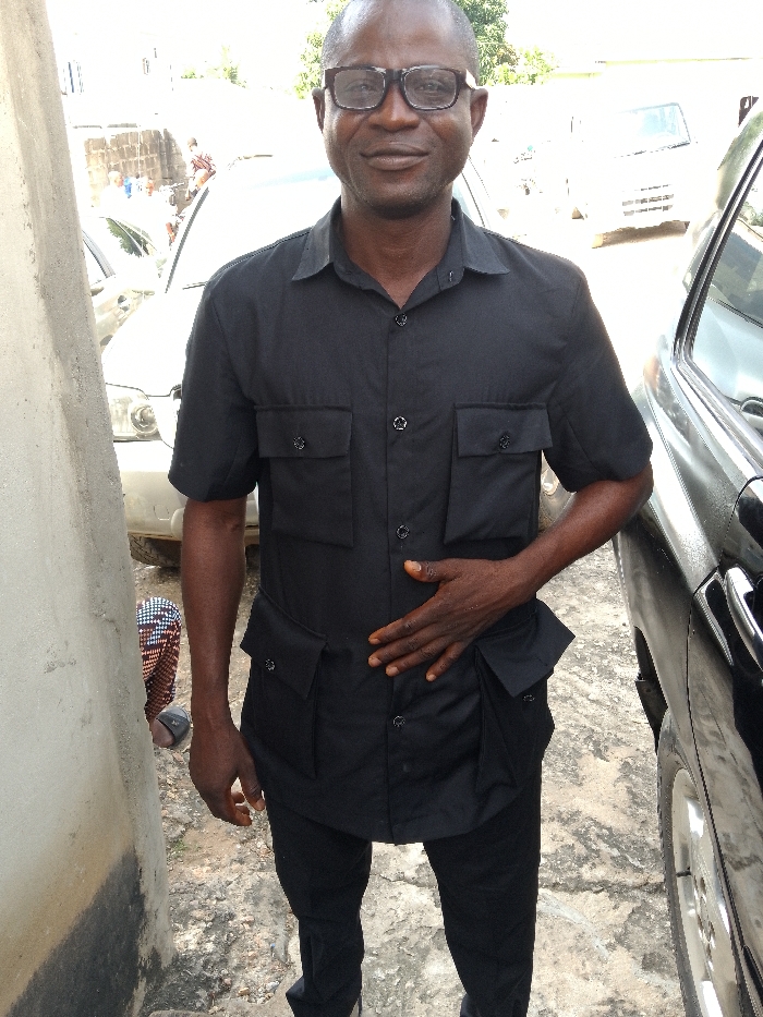 A middle-aged male subject, with dark skin, short hair, and black-framed glasses, stands centrally, facing the camera with a slight smile. He is wearing a short-sleeved black collared shirt with four buttoned flap pockets (two on the chest, two on the lower front) and black trousers. His right hand is placed on his lower abdomen. The scene is an outdoor location in Lokoja, Nigeria. To the immediate left of the subject, a light-colored concrete pillar with a darker stained base is partially visible. A light-colored SUV is parked behind and to the left of the subject. Further in the background, obscured figures are present, including one person discernible in a red and white checkered shirt. The lower body of another individual, wearing a patterned garment and a black sandal, is partially visible behind the concrete pillar. To the subject's right, the front passenger side of a dark-colored vehicle, including its tire, is partially visible. The ground consists of an uneven, light-colored paved or dirt surface. Distant buildings and green foliage are present in the background under ambient daylight conditions.