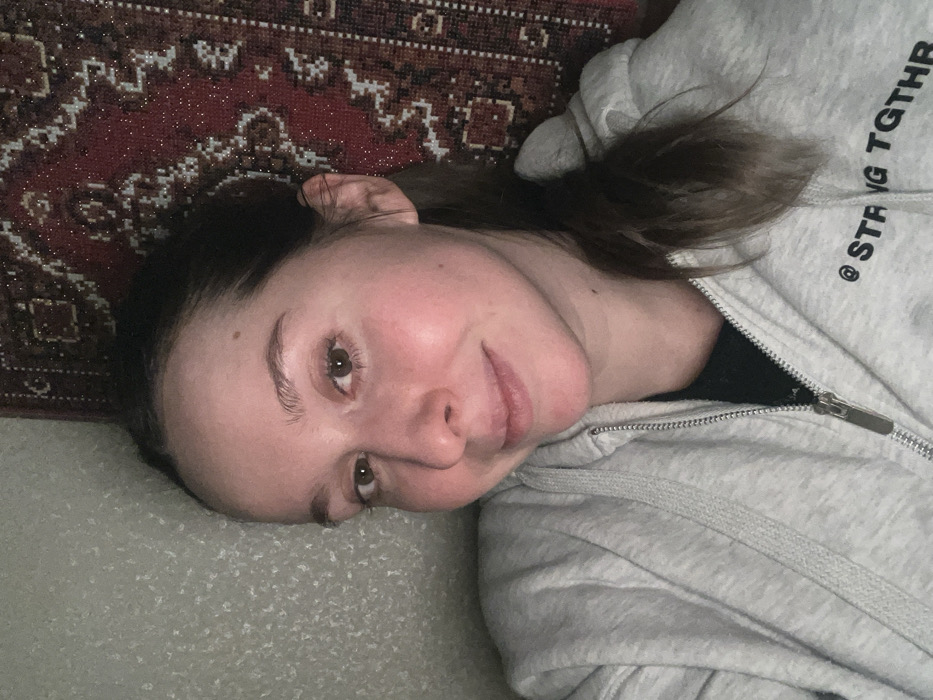 A woman lies on her side with her head on a gray surface. She's partially on a red and brown patterned carpet. The woman is wearing a gray zip-up hoodie with a black shirt underneath. The word "STRNG TGTHR" is printed on the hoodie. She has brown hair and fair skin with a slight smile. Her eyes are brown, and she's looking slightly downward at the camera.