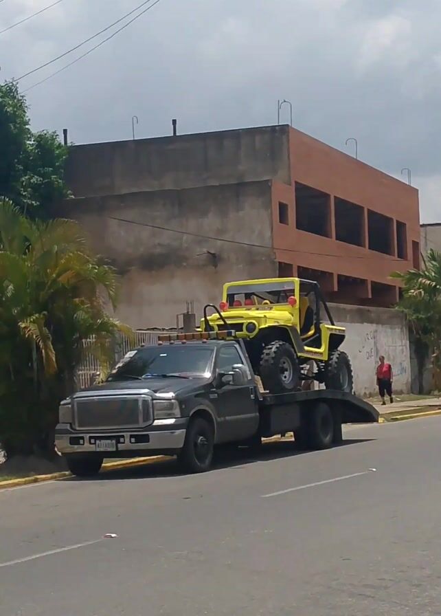 gray pickup truck carrying a yellow, four-wheeled vehicle on its flatbed. The truck is stopped on a street next to a sidewalk, with a woman walking on the sidewalk. The background includes buildings, trees, and a partially cloudy sky. The yellow vehicle appears to be a custom-built or heavily modified off-road vehicle. The license plate of the truck is visible.