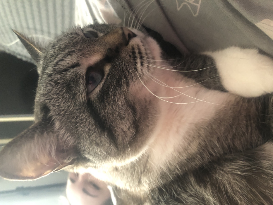 A close-up, angled photograph depicts a domestic tabby cat resting in an indoor environment in Chaikovsky, Russia. The cat, a primary subject, possesses grey and brown striped fur with distinct white markings on its chest, neck, and right front paw. Its head is oriented towards the right side of the frame, showcasing its blue-grey eyes and prominent white whiskers. In the blurred upper left background, a human presence is identified by the side profile of a face, featuring dark hair and a visible ear, with the eye appearing closed or partially closed. The cat is positioned on a light grey fabric surface, likely bedding or clothing, which exhibits a faint pattern on the right side of the image. The scene is illuminated by a soft, diffused light source originating from the upper left. The cat appears to be stationary, in a state of rest.