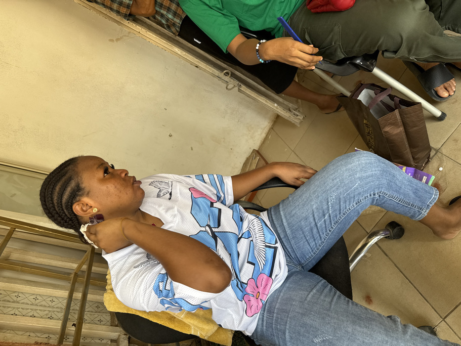 The scene depicts an interior or sheltered space with light-colored walls and a tiled floor. Three individuals are present. A female, positioned on the left, is seated in a black office chair, facing right in profile. She has braided hair and wears a white V-neck jersey with blue, pink, and white bird/floral designs, light blue distressed jeans, and dark stud earrings. A thin bracelet is on her right wrist. Her right hand is raised, holding a white cloth to the back of her neck or ear area. Acne scars are visible on her right cheek. To her right, a second individual is partially visible, seated, wearing a green t-shirt, dark trousers, and a multicolored beaded bracelet on their left wrist, holding a blue object. A third individual is partially visible in the background, wearing a plaid shirt and dark trousers. All visible feet are clad in flip-flops. A brown paper bag with purple handles is on the floor between the two seated persons, near small white objects. A metal security grill is visible in the upper left background, and a metal frame is against the wall on the right. The specific location within Abuja, Nigeria, is not discernible from the image.