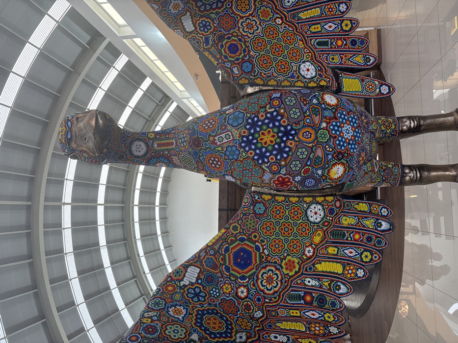 An overhead shot displays a large, intricately decorated sculpture of a bird, possibly a peacock, with vibrant, colorful beaded patterns. The bird's body and wings exhibit detailed geometric and floral designs. The head appears to be made of bronze or a similar metal. The background features a modern architectural design, with a curved ceiling consisting of numerous rectangular panels and diffused natural light.
