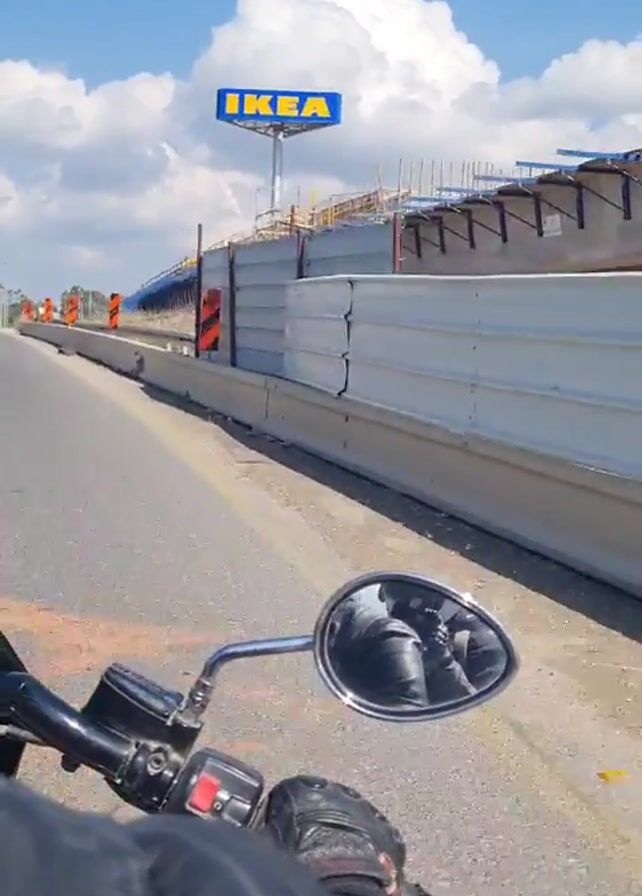 A person is riding a motorcycle on a paved road on a sunny day. The rider is wearing a black leather jacket and gloves. In the background, a large IKEA sign is visible, along with a bridge under construction. There are orange and black traffic markers along the roadside. The motorcycle's rearview mirror shows a reflection of the rider and the road behind. The sky is blue with white clouds.