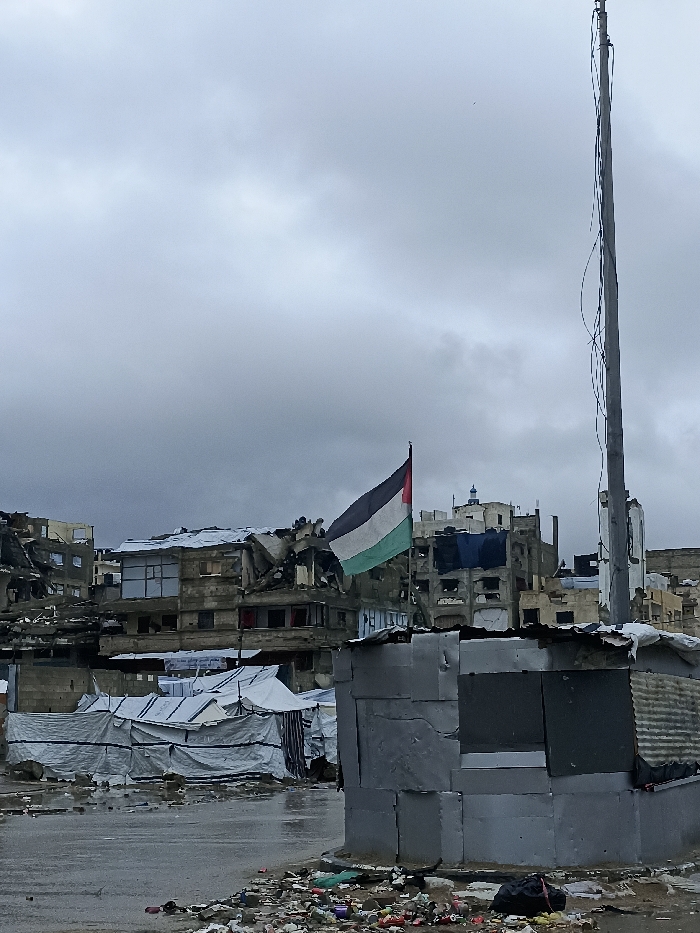 An overhead grey sky looms over a damaged urban landscape in the city of Gaza, Palestinian Territory. In the foreground, a makeshift structure, possibly a booth or shelter, constructed from corrugated metal and sheet material, stands on the right. Directly in front of this structure, a large accumulation of garbage, including plastic bottles, cans, and a black plastic bag, covers the wet ground. To the left, a damp, dark paved surface reflects the sky, bordered by several temporary shelters or tents made from white and grey tarpaulins. In the midground, a Palestinian flag with horizontal black, white, and green stripes and a red triangle flies amidst a panorama of heavily damaged multi-story buildings, many exhibiting partial destruction, exposed interiors, and collapsed sections. A tall utility pole with wrapped cables rises on the far right. No individuals are visible in the scene.