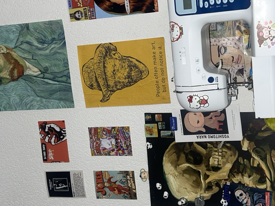 The image is a collage of stickers and images attached to a white surface. There's a reproduction of Van Gogh’s portrait, a yellow image with the text "People often make art, but do not notice it," and various pop culture references, including a "Joker" comic book cover and a "Yoshitomo Nara" print. A sewing machine with Hello Kitty stickers is also visible, as is a skull painting. The overall aesthetic is cluttered, youthful, and artistic.