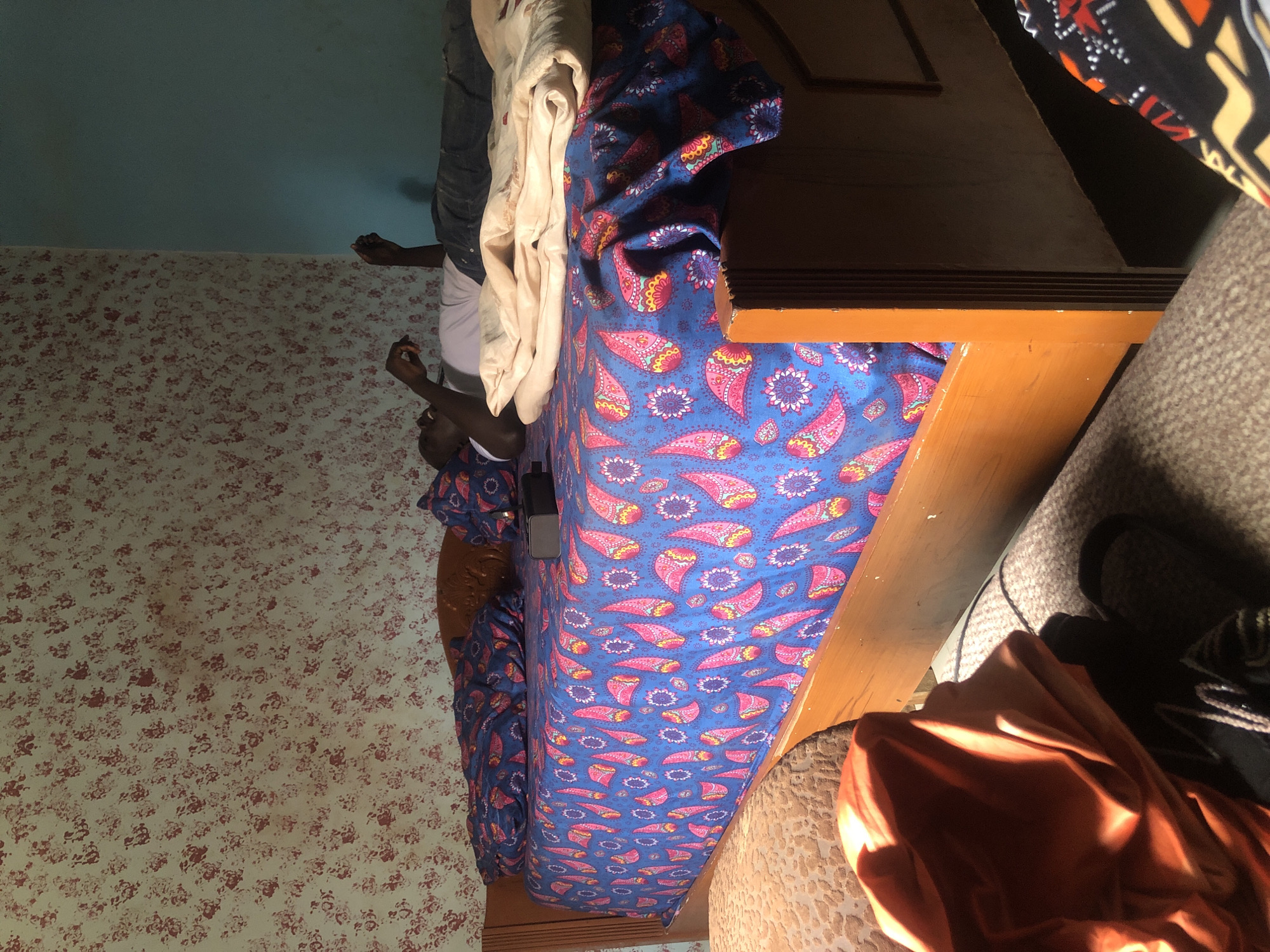 The image depicts an indoor scene in Yelwa, Nigeria, featuring a bedroom or living space bathed in natural sunlight