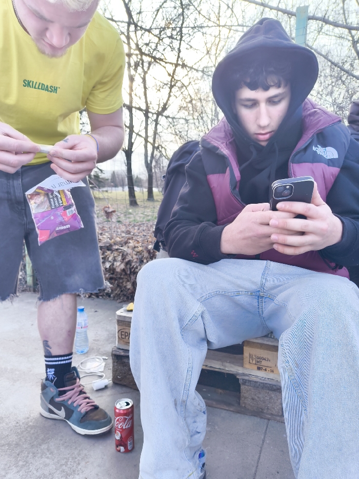 - "Two young males are depicted in an outdoor urban setting in Sofia, Bulgaria, characterized by a paved surface, sparse trees with bare branches, and a wire fence in the background" by FM-RsvT33, licensed under CC BY 4.0