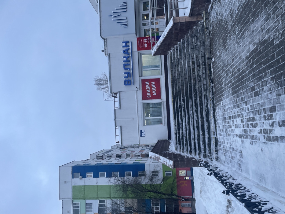 This image captures a winter street scene in Vitsebsk, Belarus. The foreground features a snow-dusted brick-paved area leading to a set of wide, snow-covered stone steps with brown and grey railings. To the left of the paved area, an ornate black metal fence separates it from a deep snowdrift. The steps ascend to a low-rise commercial building with a white facade. Above the entrance, a blue Cyrillic sign spells "ВУЛКАН" (VULKAN). An address plate reading "3A" is fixed to the left of the building's entrance. The building's front features two large windows; the left window displays a red sign with white Cyrillic text "СКИДКИ АКЦИИ" (DISCOUNTS PROMOTIONS), while the right window shows operating hours listed as "10-19", "9-18", and "9-16". A ramp for accessibility is visible to the right of the steps, leading to the entrance. In the background, a multi-story residential building with vertical sections painted in white, light green, and blue, with a pink lower section, stands behind a tree and additional snowdrifts. The sky is uniformly overcast light grey. No individuals are visible in the scene.