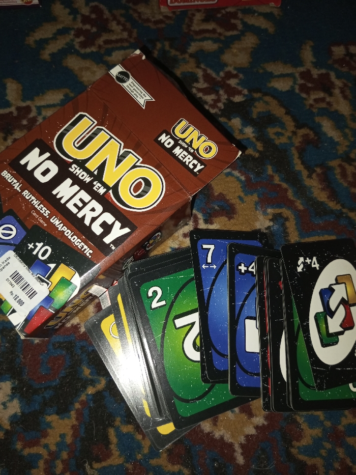 An open, tilted box of "UNO Show 'Em No Mercy" sits on a patterned rug