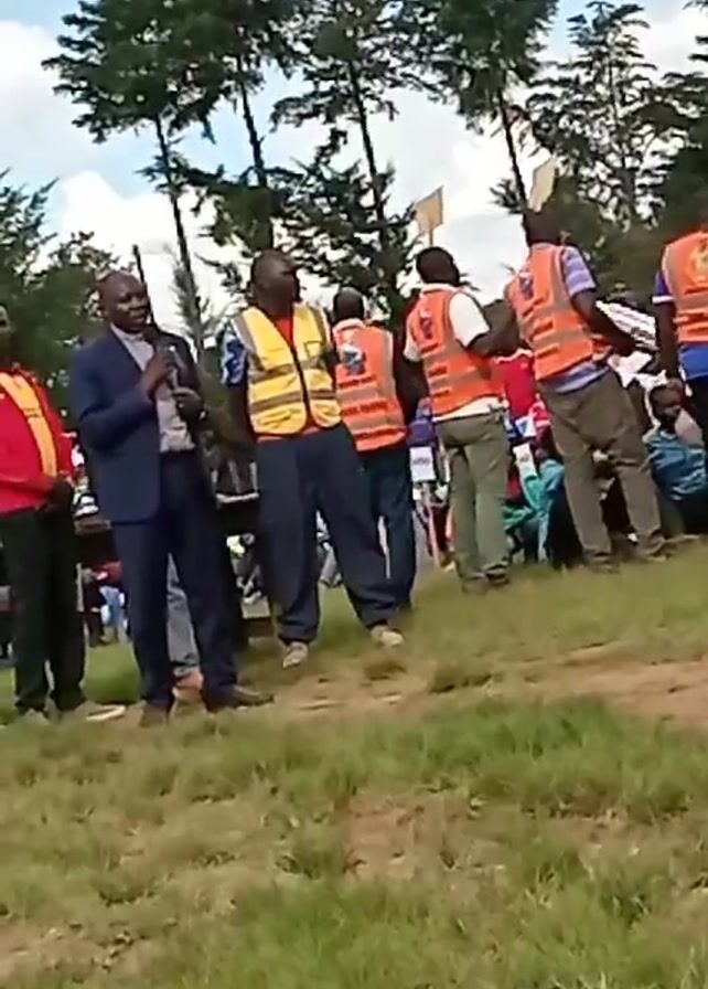 A man in a blue suit is standing on a grassy field and speaking into a microphone. Behind him, a group of people are standing. Some of them are wearing yellow safety vests and others are wearing orange safety vests. Some of them are holding signs. There are trees in the background. The sky is cloudy. Some people are sitting in the background.