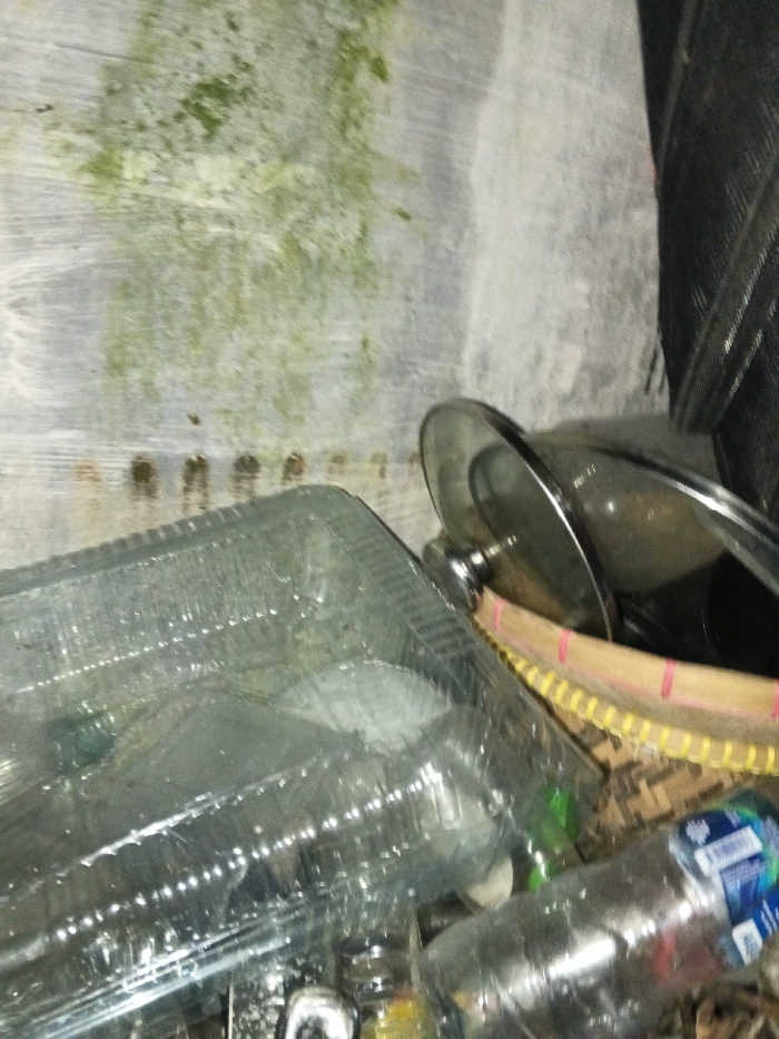The image presents a close-up view of an accumulation of household items within an indoor or semi-sheltered area in Kampung Buang Abai, Malaysia. The background consists of a light-colored wall, possibly concrete or painted plaster, exhibiting patches of green organic growth (likely algae or mold) and horizontal lines indicative of previous moisture exposure or irregular surface. In the foreground, a large, clear rectangular plastic container with a ridged lid occupies the left half of the frame. It appears to be empty or contains indistinct items. Below and around this container, several clear plastic bottles, some crumpled, are visible. One bottle, partially obscured in the lower right, bears a blue and white label, suggesting it contained bottled water. To the right, kitchenware is stacked, featuring a dark pot or pan covered by a clear glass lid with a central silver knob. This stack is situated within or next to a woven basket, characterized by a light brown rim and yellow and pink woven patterns. Further to the extreme right, a portion of a dark, mesh-like object, potentially a laundry hamper or storage basket, is discernible. No individuals, actions, or interactions are present in the scene, which depicts a static arrangement of domestic objects in a state of informal storage.
