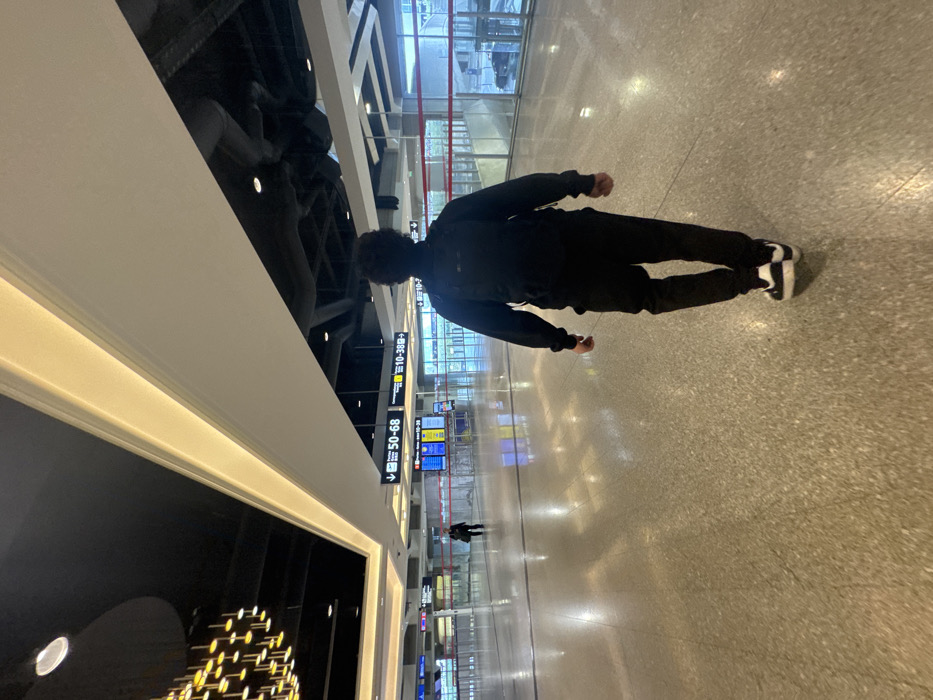 This image depicts a modern airport terminal in Mauregard, France. The scene is viewed from a slightly elevated perspective behind a male individual walking away from the camera. The man is wearing a black long-sleeved shirt or sweatshirt, black athletic pants or joggers, and black and white sneakers. A black backpack is visible on his back. His hair is dark and curly. The floor is a light-colored, polished terrazzo or speckled stone, reflecting the overhead artificial lighting. The ceiling is primarily dark, possibly black, with a prominent white architectural beam running horizontally across the upper portion of the frame, illuminated by embedded linear lights. A decorative chandelier with numerous small, golden-yellow light fixtures is visible in the upper left section of the ceiling. In the mid-ground, to the left of the main subject, another individual in dark clothing is visible in the distance, appearing to stand or walk slowly. Beyond this person, red retractable barriers or ropes are set up. Overhead signs with arrows direct traffic: one points left to "← 50-68" and another points right to "10-38 →". Below these signs are multiple digital display screens showing various colored panels, likely indicating flight information or directions. Large windows or glass panels are visible in the far background, suggesting an exterior view or another part of the terminal. The terminal appears largely uncrowded.