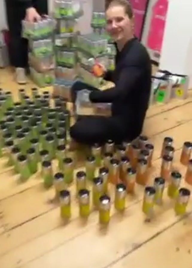 Two young women are surrounded by stacks and rows of energy drink cans in what appears to be a room with wooden floors
