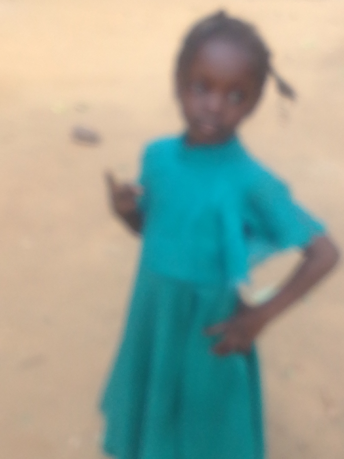 A significantly blurred, waist-up portrait captures a single individual, a child of apparent African descent, standing centrally. The child wears a short-sleeved, high-necked dress of a teal or turquoise color. Dark hair is styled with visible plaits, one extending on the viewer's left side of the head. The child's right hand (viewer's left) is raised to chest height with fingers slightly splayed, while the left hand (viewer's right) rests on the hip. The background consists of a uniform light brown, sandy-textured surface, with a small, dark, indistinct object visible on the ground to the left of the child. No discernible cityscape features are present, rendering the specific location within the city of Unknown, Unknown, indeterminate.