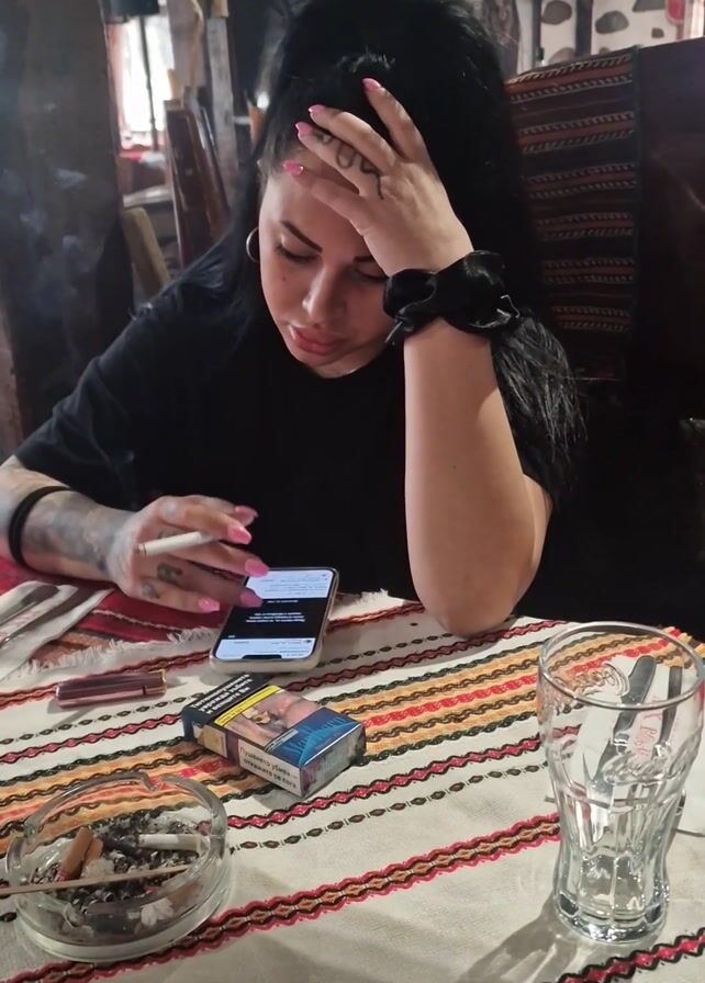 A woman sits at a table in a restaurant, looking at her phone. She holds a lit cigarette in her left hand, and rests her forehead on her right. She is wearing a black shirt, and her long dark hair is pulled up in a high ponytail. She has tattoos on her left arm and hand. On the table is a phone, a pack of cigarettes, a lighter, an ashtray filled with cigarette butts, and a drinking glass. The table is covered with a white tablecloth with colorful striped designs. The restaurant appears rustic, with exposed wooden beams and various objects displayed on the walls in the background. Smoke from the cigarette is visible in the air.
