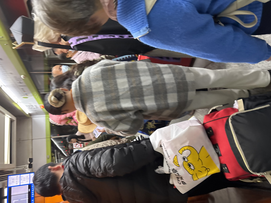 A crowded train platform scene features an array of individuals and luggage. A person in a gray and white plaid shirt stands with their back to the camera, while others are clad in blue sweaters, black jackets, and casual wear. Suitcases and bags of various colors, including red and black, are scattered around. The composition is shot from a high angle, capturing the close proximity of people and objects. A window and a screen with text are visible in the background.