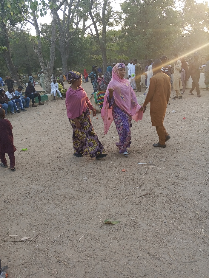 A group of people gather in an open area with trees in the background. Two women dressed in colorful, patterned clothing and headscarves are walking towards the right. A man in a brown suit walks alongside them. Other people are seated or standing in the background, some wearing traditional clothing. The ground appears to be sandy or dirt. The scene is illuminated by bright sunlight.