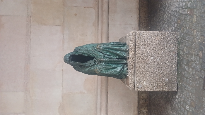 - "A full-height, vertical photograph depicts a seated, cloaked bronze sculpture with a deep hood concealing any facial features, leaving a dark void" by FM-KlF1C3, licensed under CC BY 4.0
