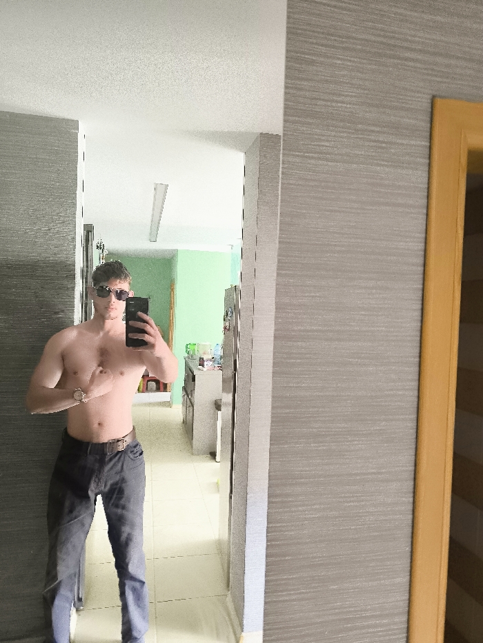 An indoor mirror selfie captures a shirtless male, estimated to be in his twenties or early thirties, with a muscular physique