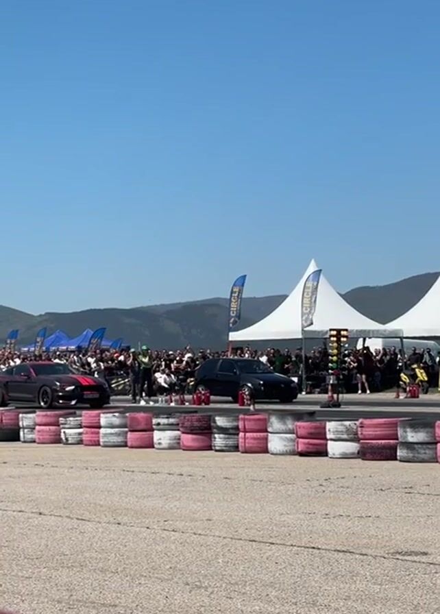 two race cars at a drag racing event. A maroon and black car is on the left side of the frame, and a black car is on the right. Both cars are positioned behind a barrier of tires, alternating between pink, white, and gray. A crowd of people stands behind the cars and the tire barrier. Several white tents are set up behind the crowd, and there are some flags with writing on them in front of the tents. The cars are preparing to race. A blue sky and mountains are visible in the background.