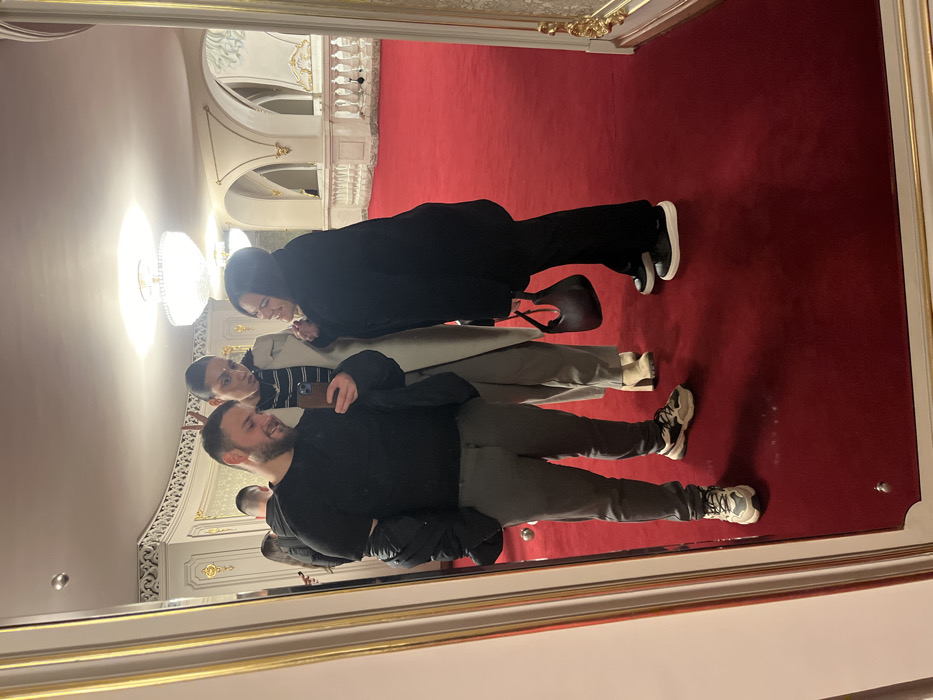 A mirror selfie captures three individuals within a grand hall, resembling an opera house or opulent event space