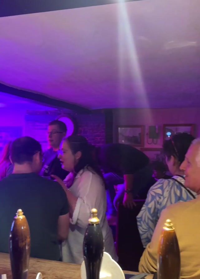 woman dancing on the bar counter in a pub. The pub is crowded with people, some of whom are watching her. There are beer taps on the counter. The lighting in the pub changes from green to red to blue. A band is playing in the background. The woman appears to be having a good time.