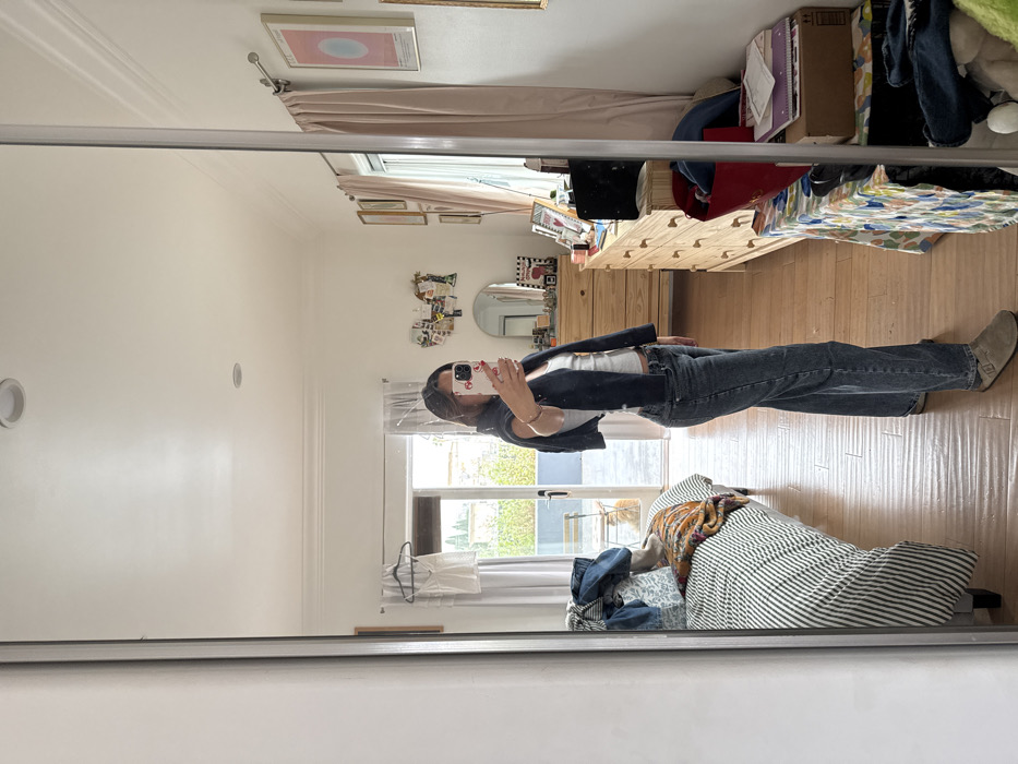 A person stands in front of a full-length mirror, holding a phone. The reflection shows a bedroom interior with a dresser, bed, and window. The person is wearing jeans, a light top, and a dark jacket. Natural light enters through the window. The mirror's frame is visible, and various objects are scattered around the room, including clothing and decorative items.