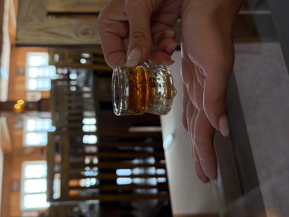 A small, clear glass vessel, containing an amber-colored liquid and a dark, slender object, is held by the thumb and index finger of a hand with light-to-medium skin tone and manicured, pale-colored fingernails. A single drop of liquid is suspended from the bottom of the glass. Directly beneath the glass, the open palm of another hand, displaying similar skin tone and nail characteristics, is positioned. The blurred background depicts an indoor establishment, likely a restaurant or cafe, with multiple wooden chairs, tables, and visible wooden architectural elements. Bright natural light enters through several rectangular windows. The scene is located in an interior space within the city of Ramboda, Sri Lanka.